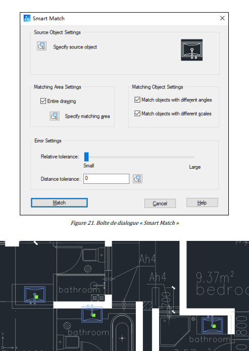 La commande SMARTMATCH a été ajoutée, permettant la sélection en lot d'objets identiques, avec positions, échelles, angles, miroirs différents. Les paramètres de correspondance peuvent être définis via la boîte de dialogue Smart Match, facilitant ainsi la sélection pour les utilisateurs.