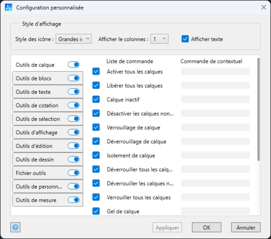 Il prend en charge l'affichage et la configuration des raccourcis de commande de la boîte à outils ZWCAD, dans des paramètres personnalisés.