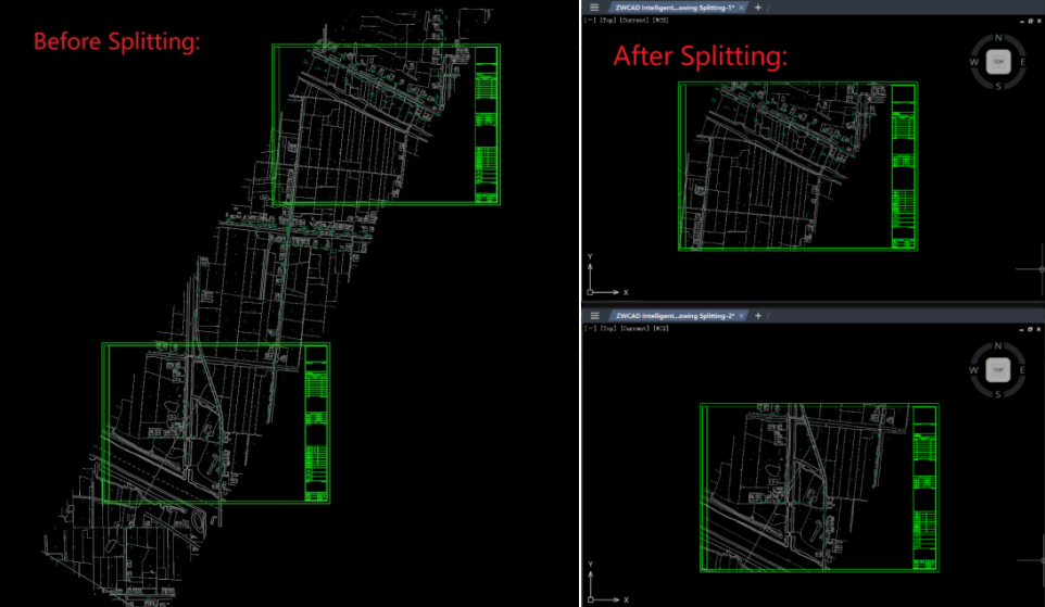 Les dessins divisés peuvent être recadrés automatiquement. Les références et les plans de base dépassant la bordure d'image peuvent être directement rognés en fonction de la plage de la bordure lors du découpage.