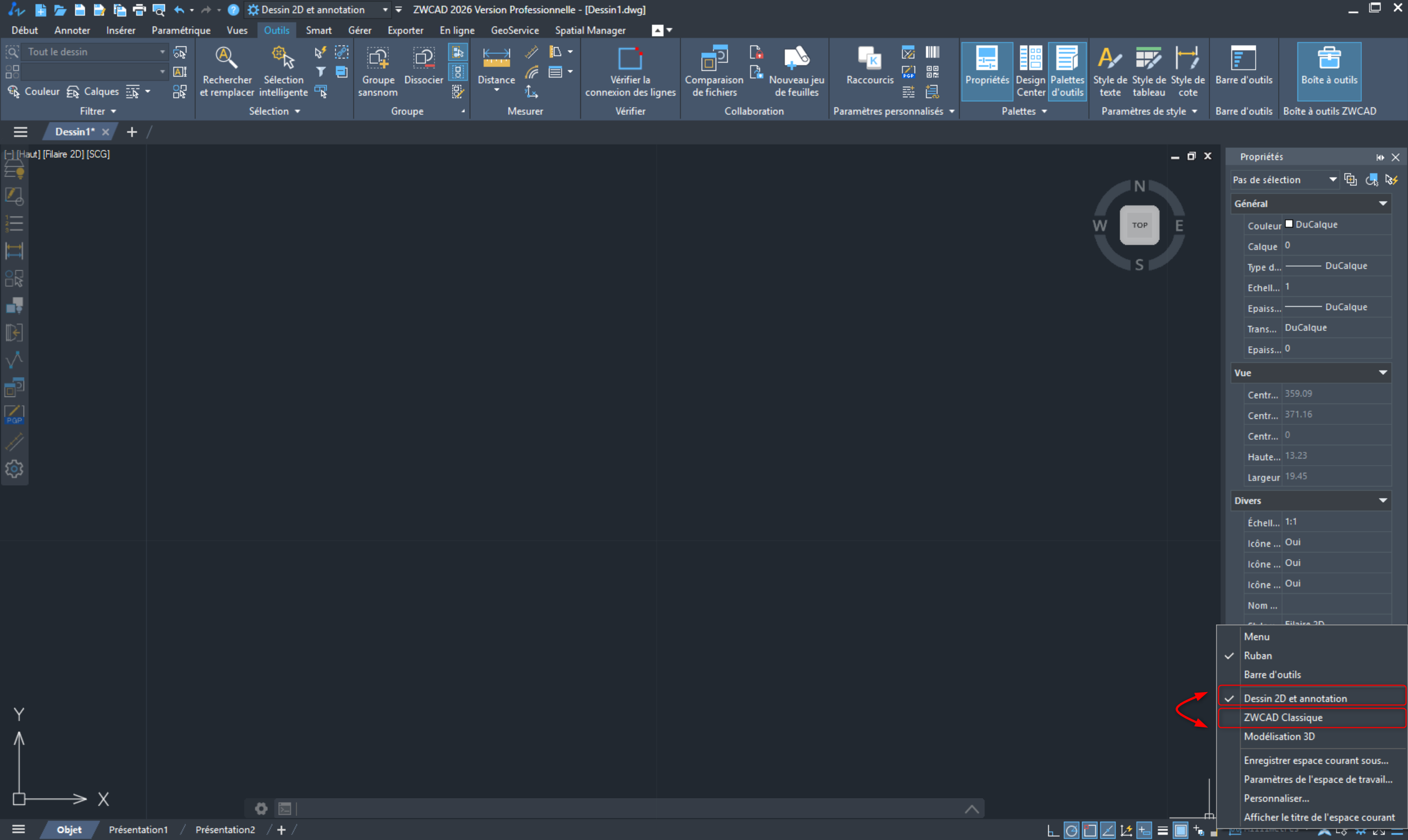 Si vous souhaitez passez d'une interface classique au ruban, ou inversement, la réponse se trouve en bas à gauche de votre écran ! Voyez l'image ci-dessous