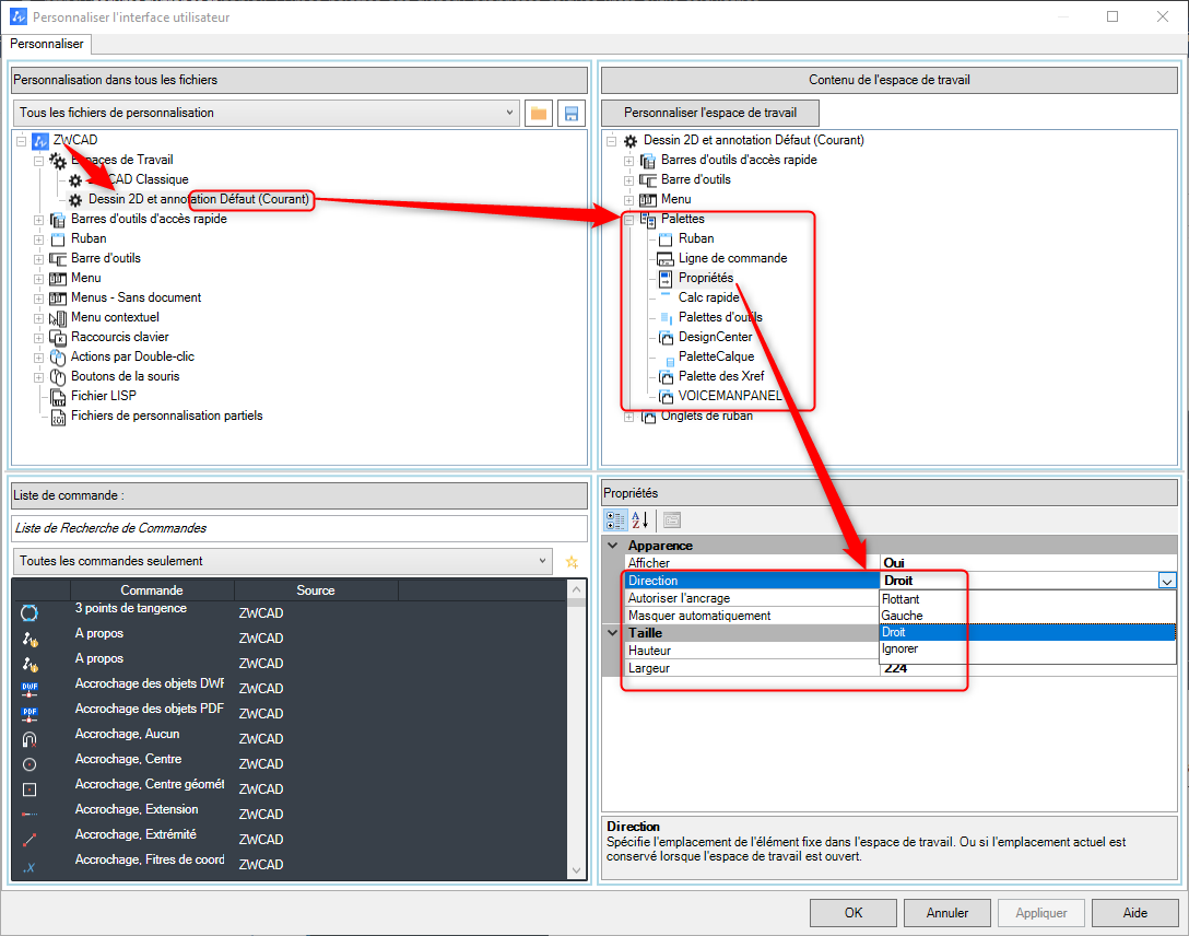 Il peut arriver qu’une palette ou une boîte de dialogue s’ouvre hors de la zone visible de l’écran. Ce comportement survient généralement à la suite d’une modification de la configuration multi-écran : Windows 10 et/ou ZWCAD n’a pas réinitialisé correctement les coordonnées d’affichage, ce qui empêche la palette de réapparaître dans l’espace de travail.