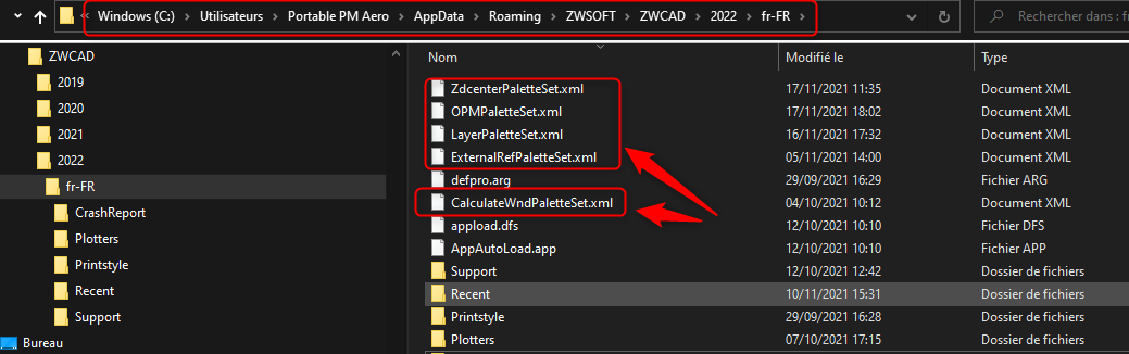 4- Allez dans l'explorateur de Windows sur le dossier : C:\Users\votre nom\AppData\Roaming\ZWSOFT\ZWCAD\202X\fr-FR et effacez les fichiers XML