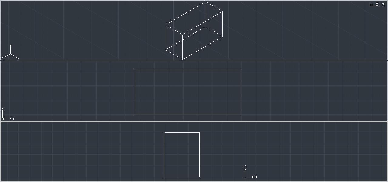 Les fenêtres de visualisation créées dans l'onglet Modèle occupent entièrement la zone de dessin sans se chevaucher. Lorsque vous effectuez des modifications dans une fenêtre, les autres fenêtres sont mises à jour simultanément. l'illustration montre trois fenêtres de visualisation de l'espace objet.