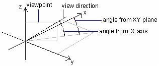 l'illustration suivante montre une vue définie par deux angles relatifs à l'axe X et au plan XY du SCG.