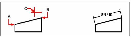 Sélectionnez la première ligne (A), sélectionnez la deuxième ligne (B), puis spécifiez l'emplacement de la ligne de cote (C).