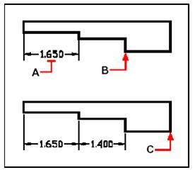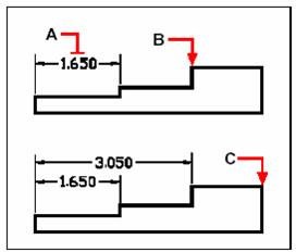 Pour ajouter une cote continue à une cote linéaire existante, sélectionnez la cote existante (A), puis la cote suivante (B).