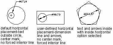 Vous pouvez créer différentes cotes de diamètre en fonction de l'emplacement du texte, des options d'ajustement et de la sélection de l'option "Toujours tracer des lignes d'atténuation entre les lignes ext" dans l'onglet Ajuster. Voici l'illustration :