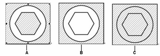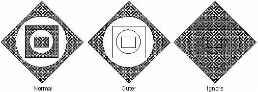 Ignorer les objets internes, ne hachurer que les objets externes. l'exemple suivant montre les résultats de la hachure d'une entité complexe avec les motifs Normal, Extérieur, Ignorer individuellement :