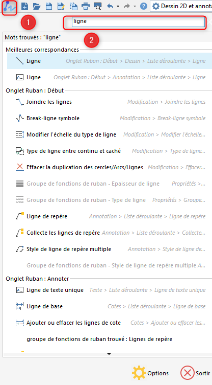 Fournissent des outils permettant de rechercher rapidement des commandes. Vous pouvez rechercher des commandes dans la barre d'outils Accès rapide, dans le menu d'application et sur le ruban. Les résultats de la recherche seront directement affichés dans le menu de l'application. Vous pouvez saisir n'importe quelle langue pour la recherche.