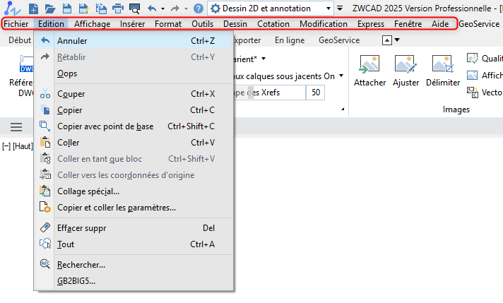 Vous pouvez utiliser toutes les options de la barre de menus située en haut de la zone de dessin de ZWCAD dans l'interface classique. Pour ouvrir la liste des éléments de menu correspondants, appuyez sur Alt et sur la touche correspondant à la lettre soulignée dans le nom du menu, puis choisissez les éléments de menu à partir de cette liste.