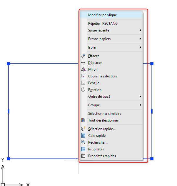 Pour accéder rapidement aux commandes pertinentes en cours d'exécution, vous pouvez cliquer avec le bouton droit de la souris sur différentes zones de la fenêtre de dessin pour afficher les menus contextuels correspondants.