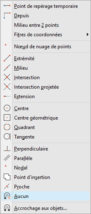Pour afficher un menu contextuel permettant de sélectionner un accrochage aux objets et un suivi, maintenez la touche Maj enfoncée et cliquez avec le bouton droit de la souris n'importe où dans la fenêtre de dessin.