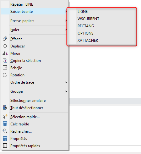 l'option "Dernière entrée" sert à enregistrer les manipulations récentes. Depuis la liste "Dernière entrée" du menu contextuel, vous pouvez visualiser les dernières manipulations ainsi que les options de commande précédentes, et également exécuter des commandes en les sélectionnant directement dans la liste "Dernière entrée".