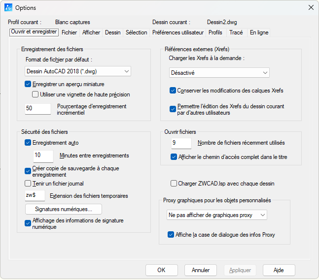 Par défaut, vos paramètres actuels sont enregistrés dans un profil nommé "Par défaut". Le nom du profil actuel, ainsi que le nom du dessin en cours, sont affichés dans la boîte de dialogue Options de ZWCAD.