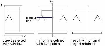 Vous pouvez créer une image miroir d'objets sélectionnés dans l'espace 3D. Le miroir est défini par un plan que vous spécifiez en utilisant trois points, en sélectionnant un objet plan 2D existant, en alignant le plan avec les plans XY, YZ ou XZ du SCU actuel, ou en l'alignant sur la vue courante. Vous avez la possibilité de conserver ou de supprimer les objets d'origine.