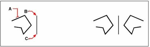 Gauche : Pour symétriser un objet, sélectionnez-le (A), puis spécifiez le premier point (B) et le deuxième point (C) de l'axe de symétrie : Résultat
