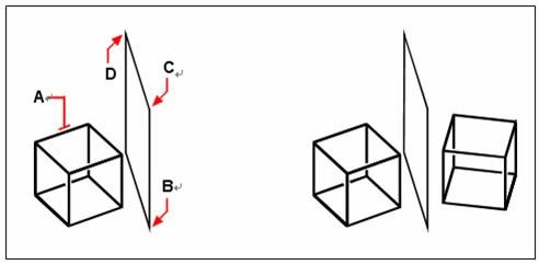 Gauche : Sélectionnez l'objet à refléter (A), puis spécifiez le premier point (B), le deuxième point (C) et le troisième point (D).