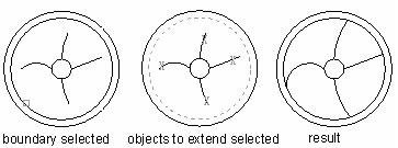 La fonction TRIM peut également être utilisée pour prolonger des objets. À l'invite de sélection des objets, maintenez la touche MAJ enfoncée et sélectionnez les objets à prolonger. Les objets sont alors prolongés au lieu d'être rognés.