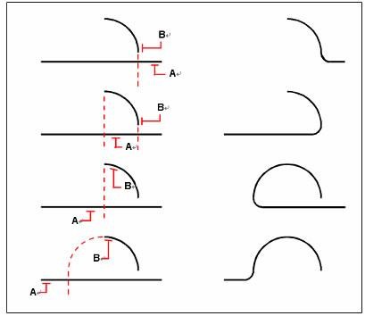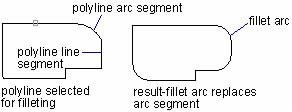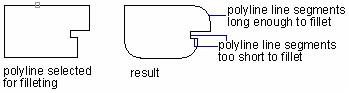 Lorsque le rayon de congé est défini sur 0, aucun arc de congé n'est inséré. Si deux segments de polyligne sont séparés par un segment d'arc, le système supprime ce segment d'arc et prolonge les lignes jusqu'à leur intersection.