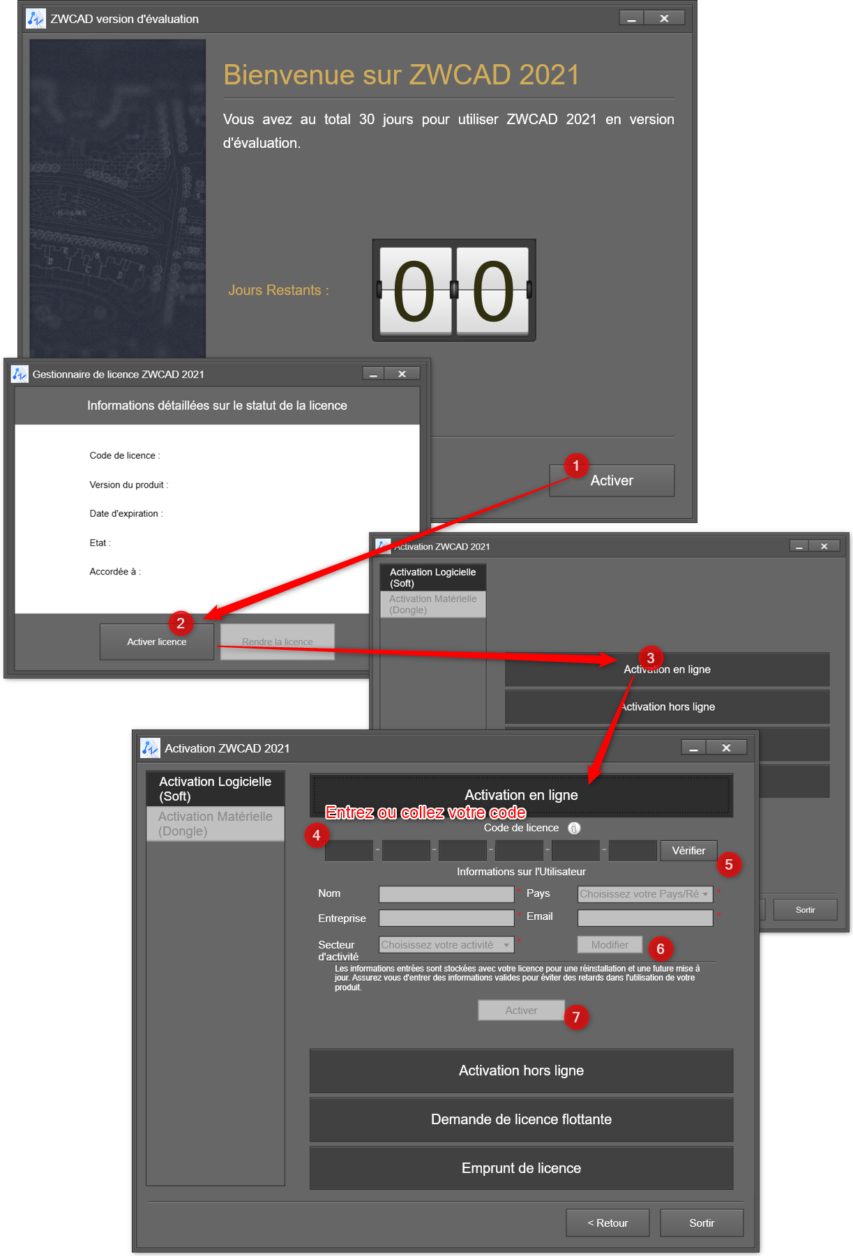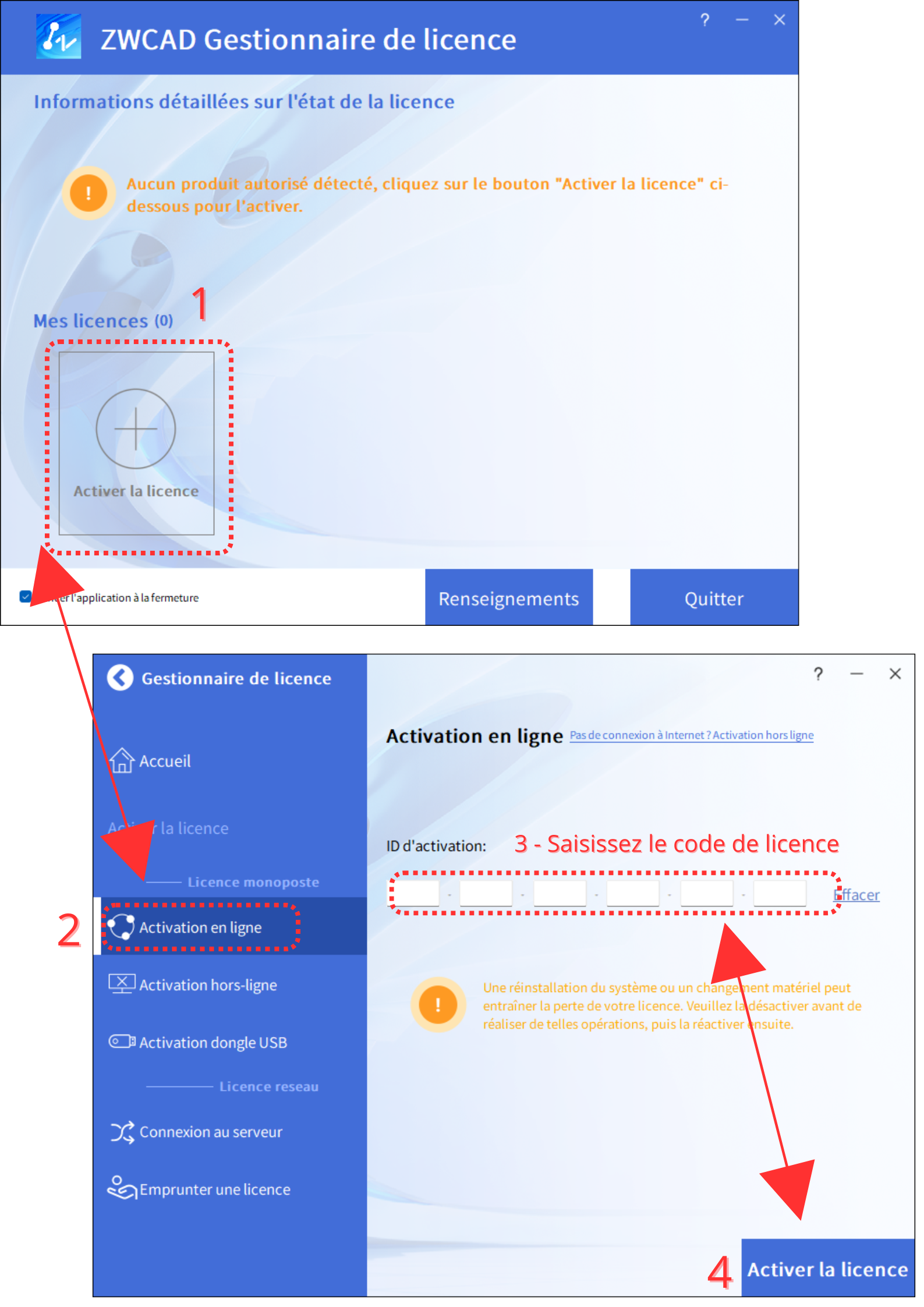 Pour activer votre licence, lancez simplement ZWCAD. Lors du premier démarrage, une fenêtre d’activation apparaît automatiquement :