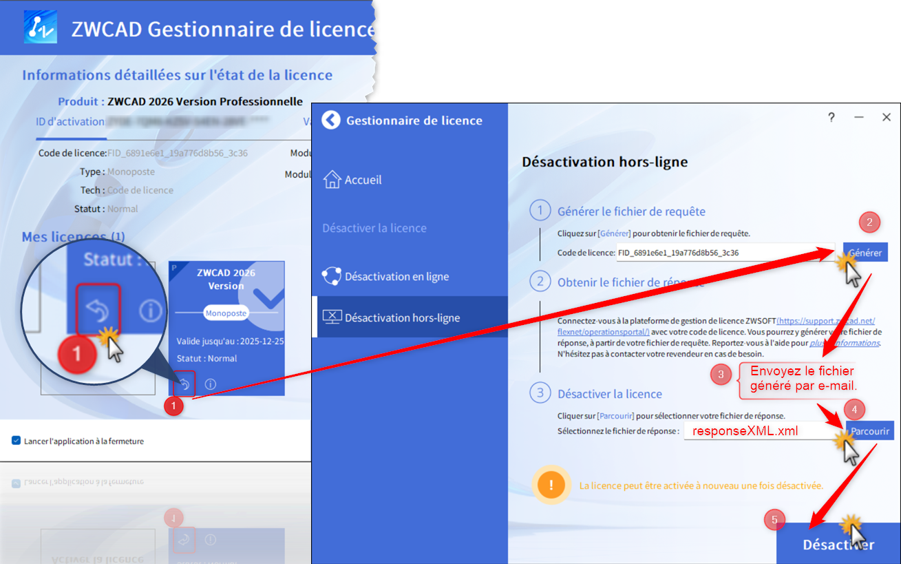 1️⃣ Cliquez sur Rendre la licence puis Désactivation hors ligne