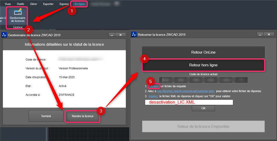 2️⃣ Cliquez sur "Rendre la licence" puis "Retour hors ligne"