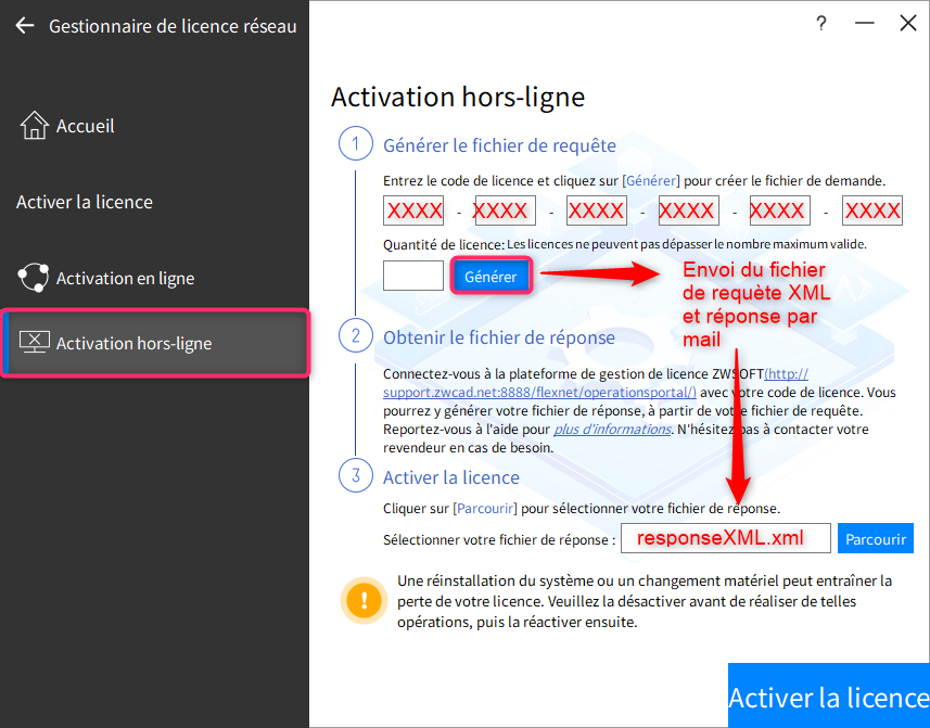 1️⃣ Cliquez sur Activer la licence puis Activation hors-ligne