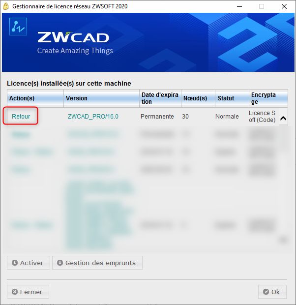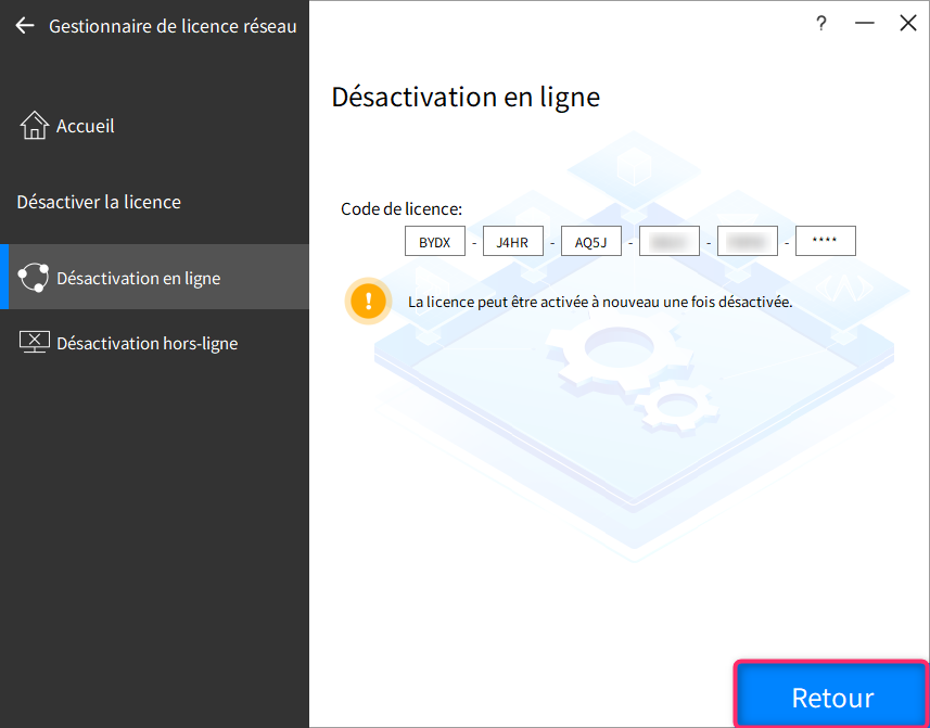 Identifiez ensuite la licence à désactiver, puis cliquez sur le bouton "Retour" situé dans la colonne de gauche :