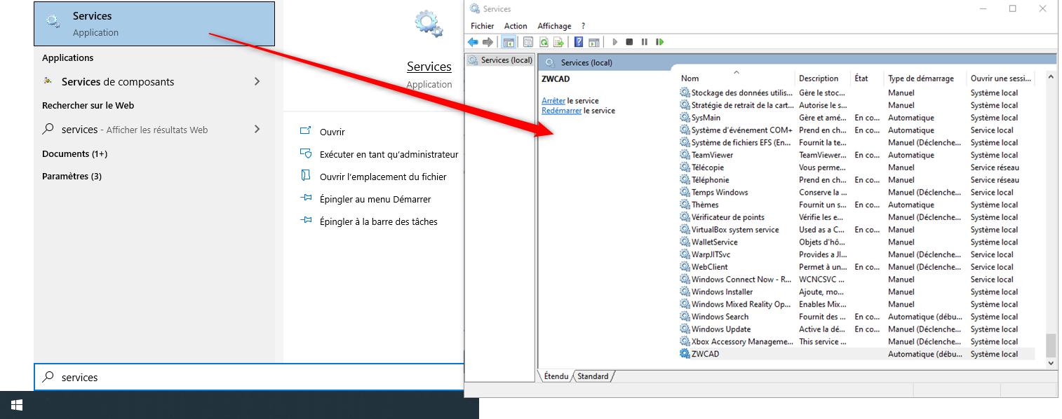 Sélectionnez ensuite le service de licence réseau ZWCAD (nom donné lors de la configuration du service), puis arrêtez-le :