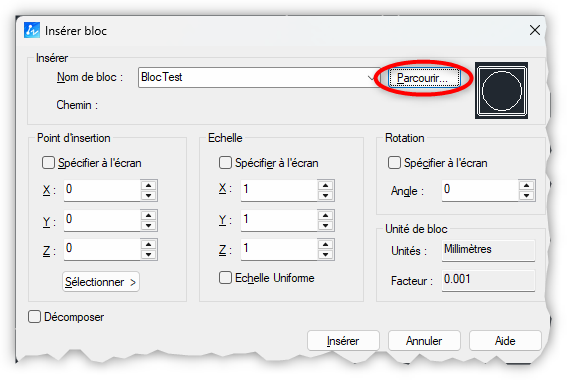 Lors de la création du bloc, faites attention à l’unité du bloc, qui peut être prise en compte lors de l’insertion :
