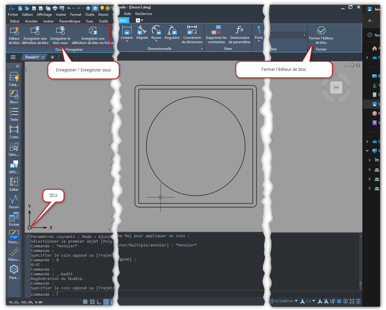 La création d’un bloc depuis l’éditeur de blocs offre plus de confort que la commande BLOC, surtout lorsqu’il s’agit de le modifier ou de le dupliquer sous un autre nom.